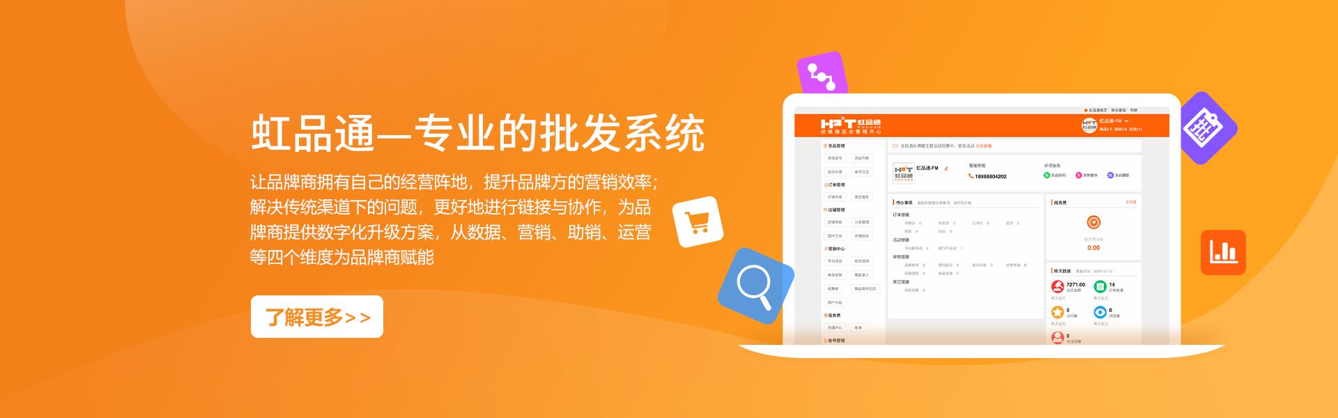 南寧虹品通軟件科技有限公司成立于2014年,是一家開發(fā)軟件技術服務公司。公司總部位于中國綠城南寧市,專注軟件行業(yè)系統(tǒng)支持和供應鏈大數據開發(fā),并將其應用于商業(yè)領域。掌握供應鏈系統(tǒng)研發(fā)、商品流通大數據、批發(fā)零售商城等核心技術,并持有多項技術專利和著作權。公司致力于幫助生產廠家、商品流通、銷售型企業(yè)向互聯(lián)網化轉型升級,利用互聯(lián)網獲取客戶、洞察市場、服務客戶
